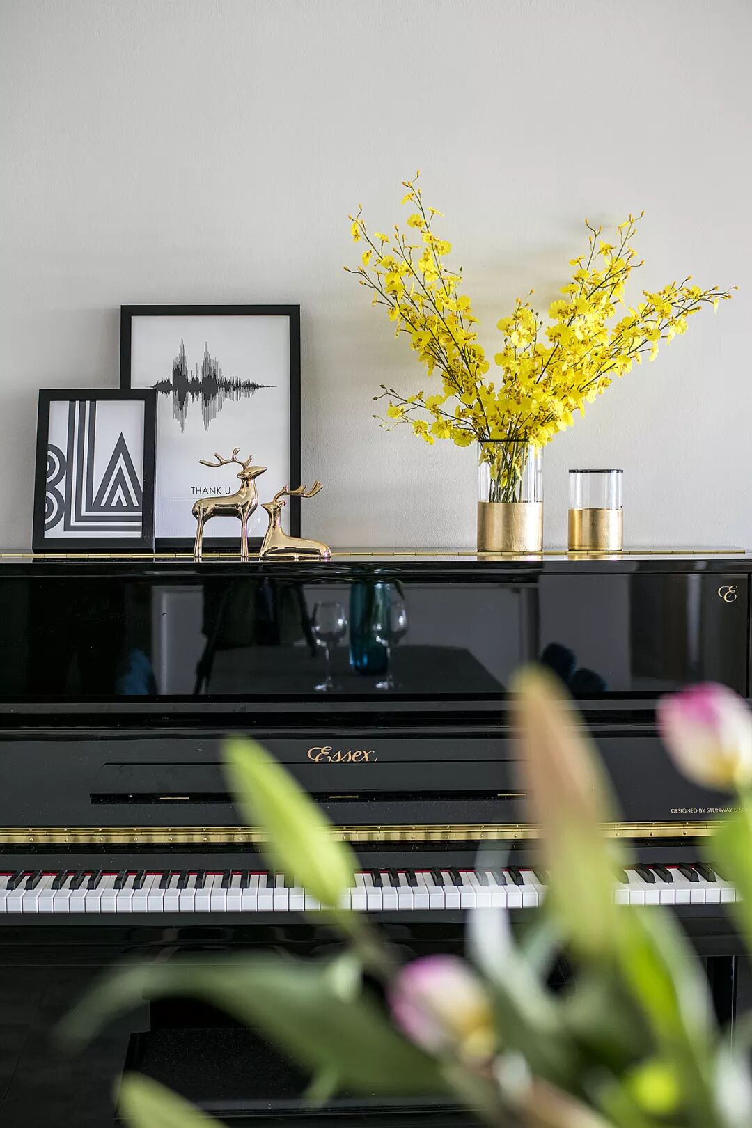 ▲餐厅旁边摆一台钢琴,钢琴上方再摆一盆跳舞兰装饰,结合2只金属的装饰鹿,显得格外的优雅端庄。