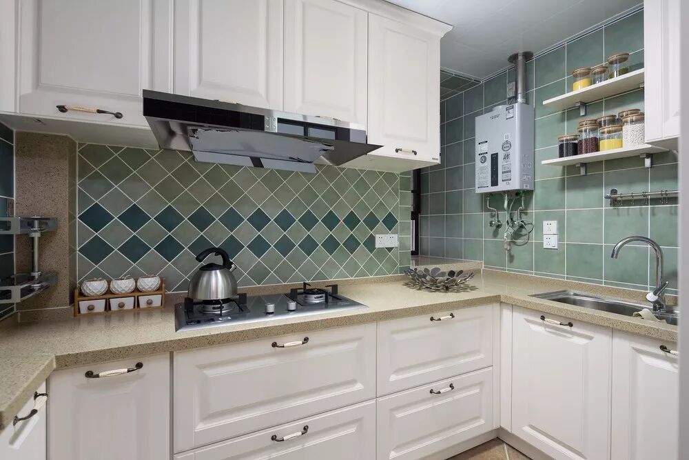 ▲ 新鲜、安静、生机的绿色墙面,搭配质朴、淡雅、干净的白色橱柜,让厨房空间充满了大自然的清新。