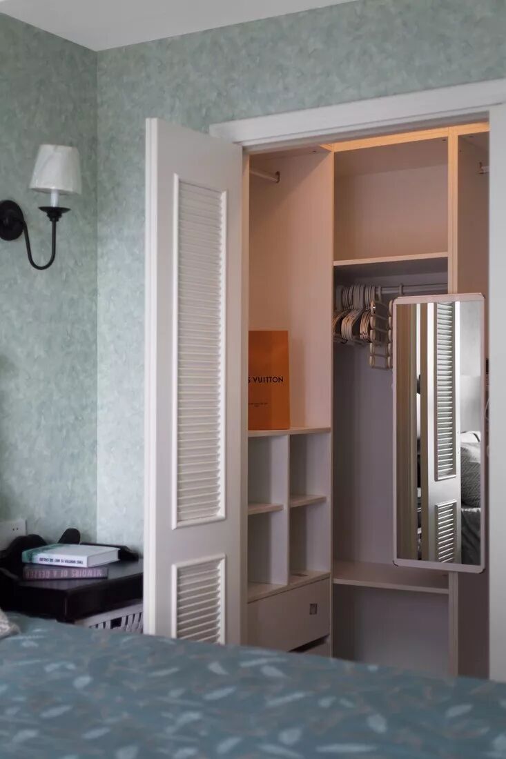 ▲ 女主大爱的步入式衣帽间,各使用区域分区明了,空间有限所以采用了百叶折叠门,不失清新的别致美。