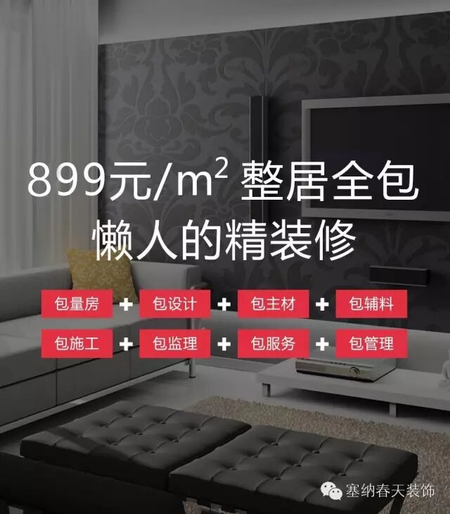 此套餐为899元/平米,45天工期的新房套餐,以一口价“建筑面积*套餐价”方式,让客户享受3D云高精尖设计、所见即所得样板间交付、100%自有工人、毛坯到精装修只需45天、一次包死价全程无增项、过程全透明手机看进度、24*7售后服务、加上精选八大主材的五星级家装。