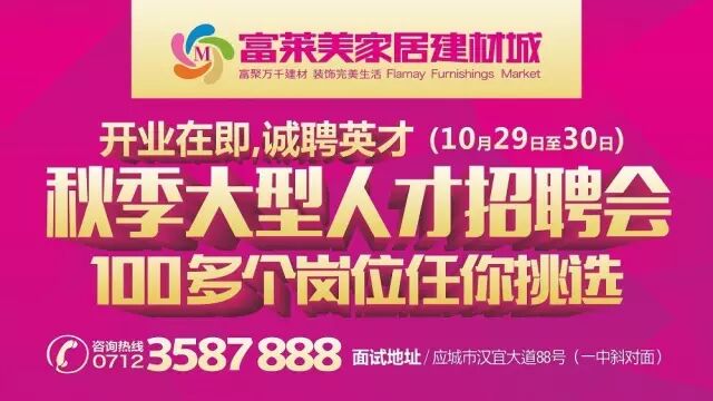 富莱美家居建材城秋季大型人才招聘会100多个岗位任你挑选待遇好、福利好、有社保,而且晋升空间大!