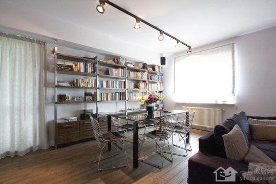 根据墙面面积设计书架大小,可以用简单的木搁板完成,用金属固定,架子和柜子的结合也满足了不同物品的收纳需求。