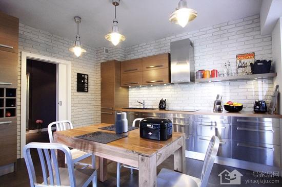 厨房采用木质和金属材质的橱柜设计,整个空间很有层次感,同时,金属材质的橱柜设计提高了亮度,减少了空间了封闭感。