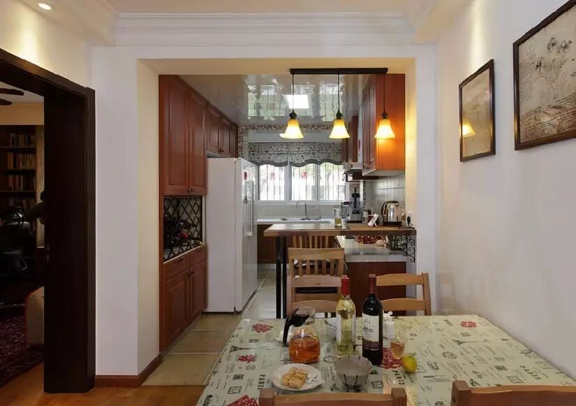 厨房与餐厅的隔断可以是推拉门酒柜,开放式的则可以利用吧台等,这样的隔断显得既实用又美观;