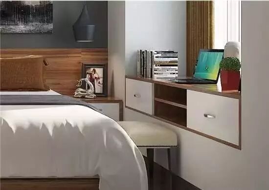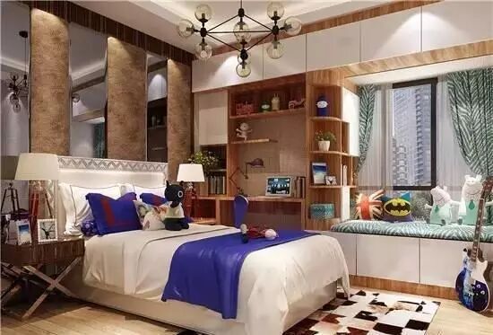 床靠墙摆放,床头延伸出书柜和书台,一个设计就能满足睡眠、休闲、学习多种愿望。