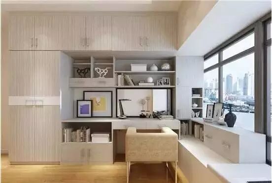 飘窗柜与书台形成一个迷你书房,中部榻榻米可以当沙发,地柜可以收纳很多物件。