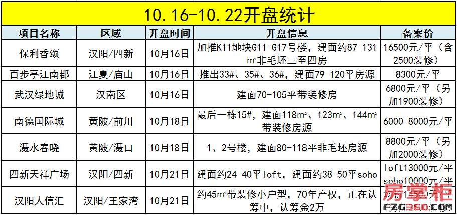 据不完全统计,本周预计有7个项目入市,其中四新天祥广场预计21日开盘,推出1号楼,建面约24-40平loft,建面约38-50平soho,loft均价13000元/平,soho均价10000元/平,首付不到20万。汉阳人信汇预计21日开盘,主推46㎡带装修小户型,毛坯备案均价14400元/平,另加2500元/平装修。