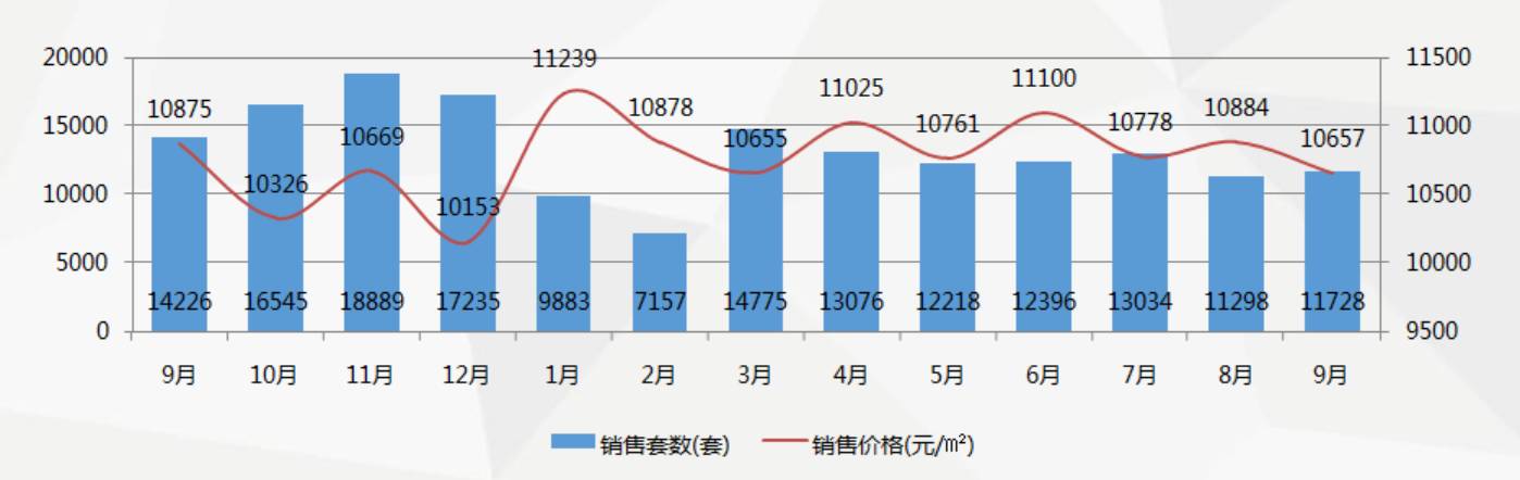 据浦江(中国)房地产市场分析数据统计显示,2017年9月份,武汉市主城区(12大主城区和蔡甸区),成交均价10657元/㎡,环比下跌2.1%,同比下跌2.0%;总销售套数11728套,环比上涨3.8%,同比下降17.6%;日均成交391套,套均面积106.3㎡。