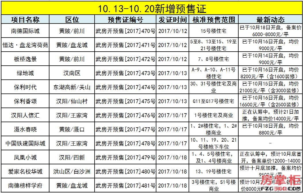 据统计,本周新增预售证项目12个,其中业态为住宅的项目有11个,7个项目已于本周或上周开盘,4个项目预计在下周开盘,4个待售项目尚在认筹中,其中2个位于汉阳,1个位于白沙洲,1个位于黄陂。