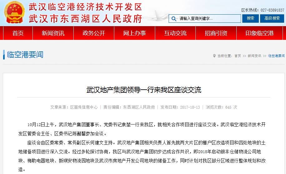 1、10月12日,武汉地产集团与东西湖区就相关合作项目进行交流,经过多轮探讨协商,东西湖区与武汉地产集团初步达成合作共识,将在2018年启动多宗优质地块的储备工作,未来还将对东西湖部分区域进行整体规划和改造。