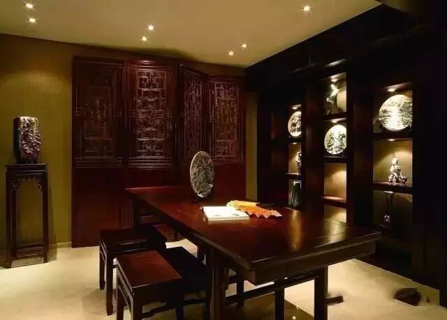 特点:家具以木质为主,讲究雕刻彩绘、造型典雅,书画、刺绣、色彩以深色沉稳为主,空间上讲究层次,多用隔窗、屏风来分割,用实木做出结实的框架,中间用棂子雕花,做成古朴的图案。