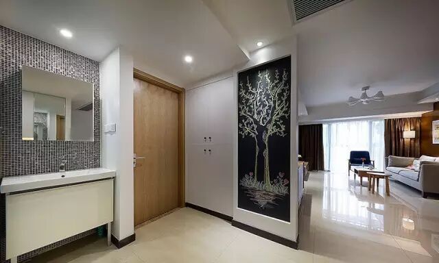门木的边框与沙发背景墙连为一体,门也成为背景墙的一部分,只是出门时别找不到在哪里开门哦!