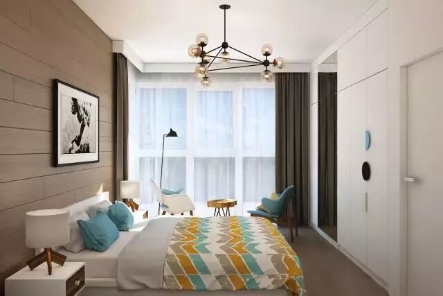 床尾对面的墙,做了嵌入式的衣柜设计。因为阳台还需要晒衣功能,所以在阳台和卧室中间加装了窗帘。