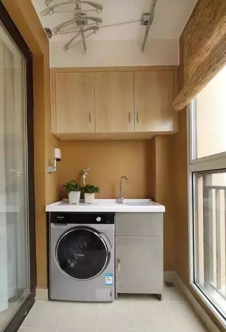 家里只有一个阳台,自然作为晾晒空间了,底部是洗衣机一体柜,上面墙壁打了吊柜,使用贯穿全屋的原木色,还将墙角处充分利用起来。