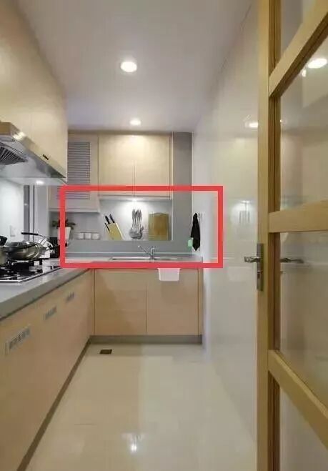 家里家具基本都是原木色,厨房也不例外,选择了原木色整体橱柜。L型的设计,给留有的活动区域挺宽敞,墙壁上也打满了吊柜,收纳足够了。在标记的位置可以看到,有一排置物区,放餐具最合适不过了。