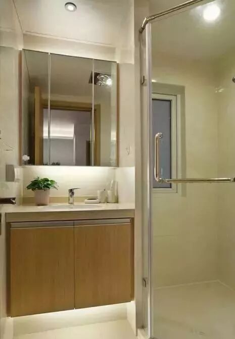 卫生间说实话真的好小,但为了方便使用,还设了玻璃淋浴房,这种不规则的形状是最节省空间的。浴室柜底部悬空,也是考虑到避免受潮发霉、开裂等情况的出现,毕竟是木质材料,多注意最好。