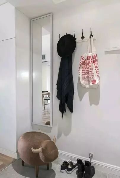 像上面这种,在玄关处装上一面镜子,在下面做一个换鞋凳,再沾上几个挂衣钩,真的是很实用。鞋柜下方留下15公分左右的高度还可以放经常穿的鞋子,这样就不用每次换鞋的时候麻烦了。在鞋柜的中间留一部分的空白处还可以用来放钥匙或者一些小盆栽当装饰。