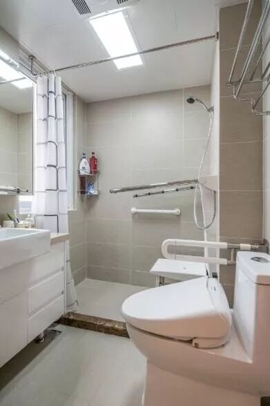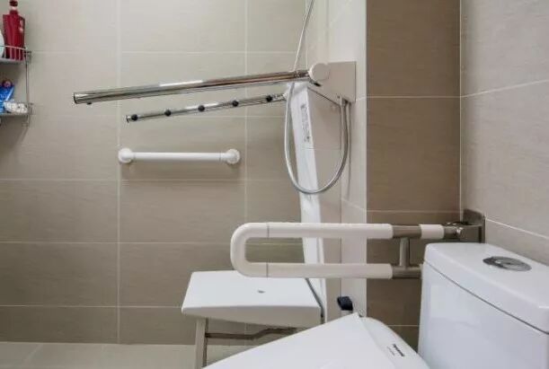 这个家在装修时很多东西都是在母亲住的前提下设计的,比如特地安装了松下的坐式淋浴,马桶旁边安装方便起身的斯塔夫老年人扶手,因为这样的设计能让老人的安全有很大的保障。