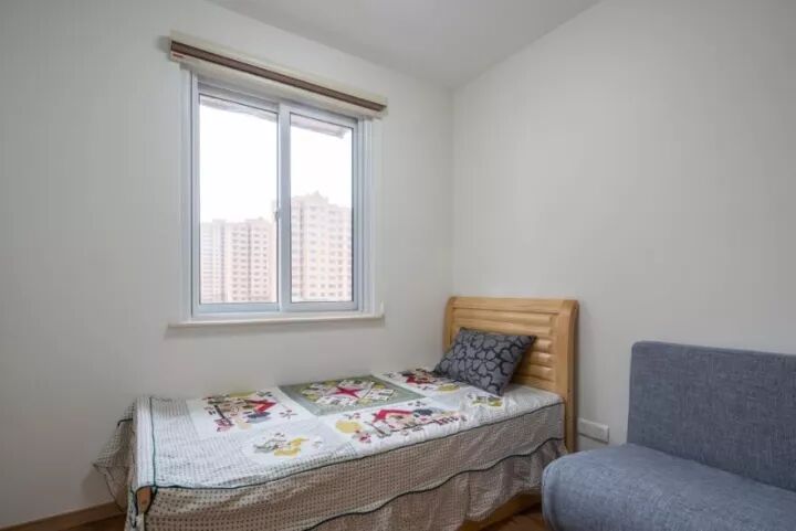 吴叔母亲的房间主要以安全舒适为主。为了保护老人的腰椎选择了比较硬的木板床,旁边一个单人沙发既方便目前平常闲坐还能充当床头柜来用。