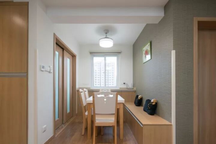 房间为数不多的改造就是餐厅这个区域,原本的餐厅是全封闭的,与客厅之间有一堵墙,为了让空间更大,设计师将这堵墙拆掉,吴叔是个非常热情好客的人,经常会在家中宴请好友,为了能够容纳下更多的人请设计师设计了卡座。