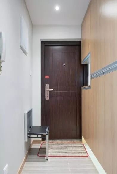 房子的面积不大不小,84㎡的大小足够业主一家居住。进门就是玄关,左手侧的一排全是定制的柜子,鞋衣柜一体可以将业主一家不常用到的东西都放进去。柜子里安装了松下旋转鞋架,可以收纳放置至少40双以上的鞋子,一长排的鞋柜中除了收纳鞋子,还能放置日常用的包,伞等生活小物件,还有外套的挂放。二来搭配整体色调,一侧的折叠座椅也是方便家人换鞋之用。