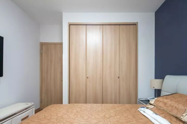 与卫浴间相邻也就是家里最内侧的房间就是吴叔夫妻俩的主卧,简约的风格中有着一种宁静感。床旁边的衣柜选用的是松下的四折门衣柜,这种折门的形式更加方便在衣柜中寻找拿取衣物。