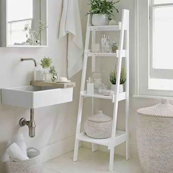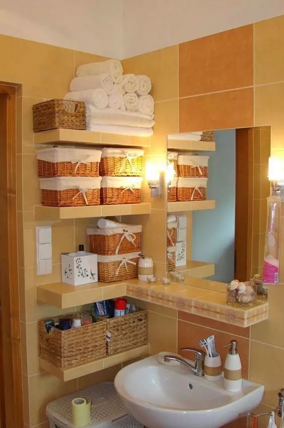 台盆附近的空间想要利用起来,其实很简单,简单的收纳架随意放置在台盆柜四周,不仅让它变得个性起来,还能方便室内收纳。(收纳架小程序)