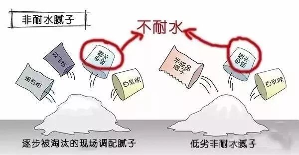 非耐水腻子最大的缺点就是,遇水容易溶解,墙面一潮湿就化了,好一些的情况是发霉,恶劣一些的情况连发霉的机会都没有,直接就掉了。