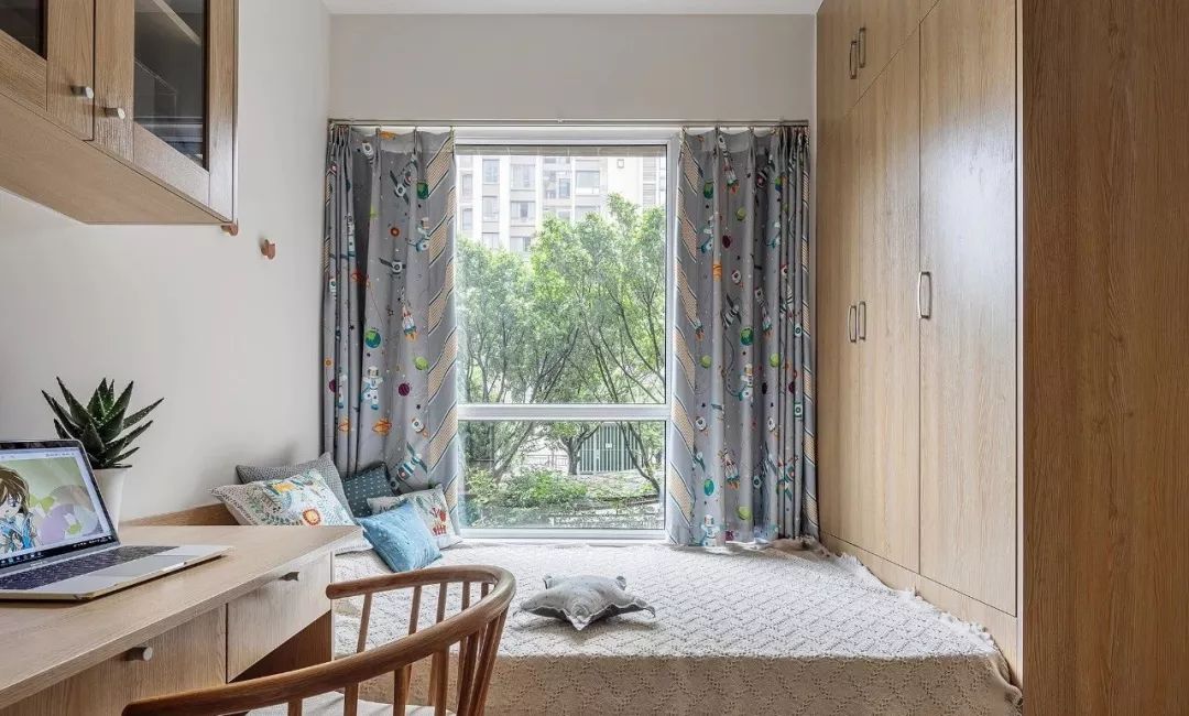 儿童房同样是采用榻榻米设计,与衣柜、书桌一体设计,房间虽不大,但是功能却是很齐全的。