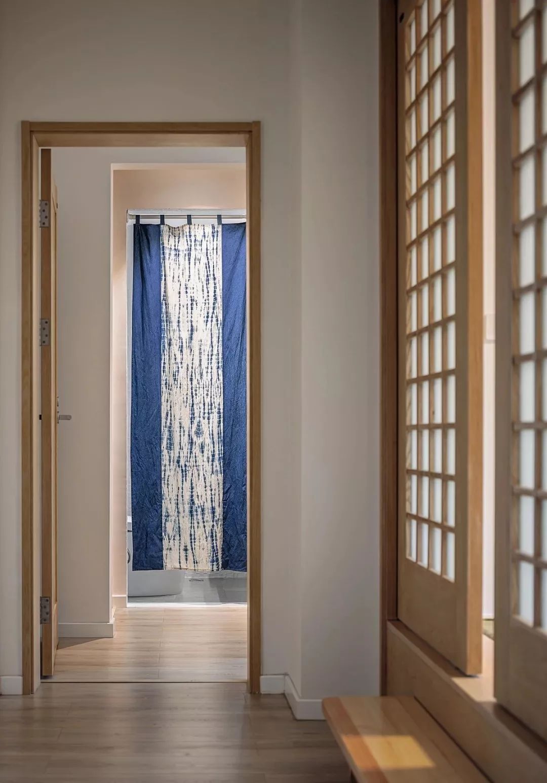 从客厅沙发处看,餐厅利用墙面设计储物柜与水吧,丰富生活情调。餐厅与玄关之间采用日式门帘作隔断,青色扎染门窗,也颇具日式韵味。