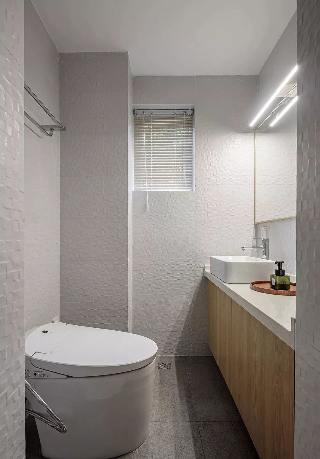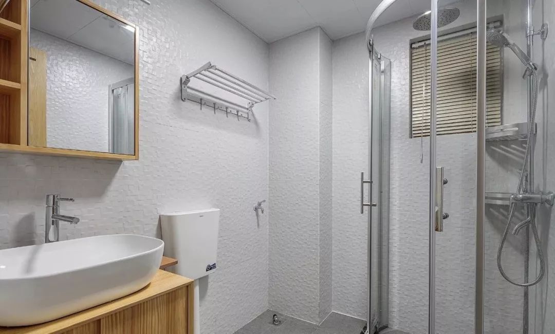 客卫,灰色地砖搭配肌理感丰富的白色墙砖,整体看简洁大方,但又不会单调乏味。