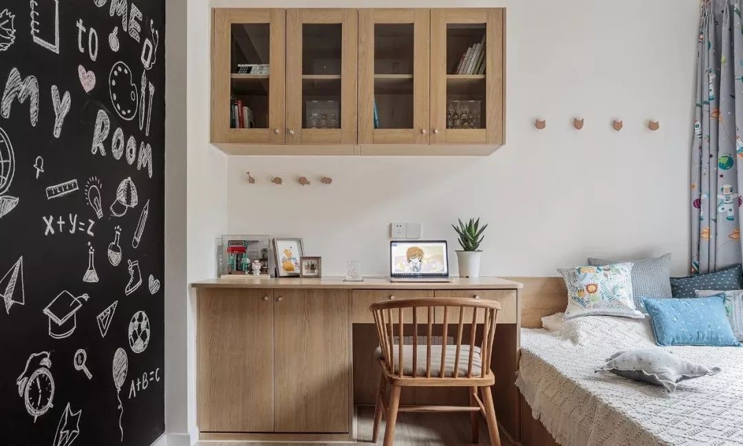 书桌、书柜的设计,满足了孩子学习与存放书籍的需求。黑板墙的设计,给孩子提供一个自由发挥画画天赋的地方。