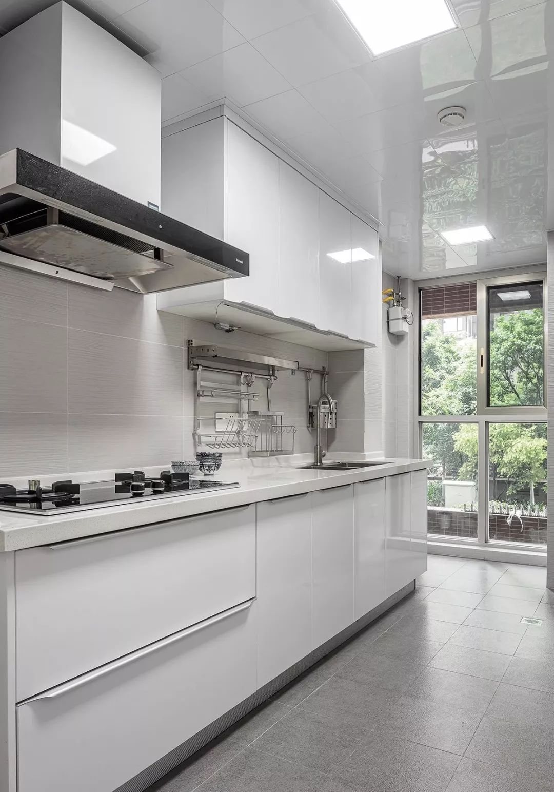厨房的橱柜使用浅灰色的瓷砖搭配白色烤漆柜门、象牙白台面,连顶面铝扣板皆采用白色,非常整洁干净,有这样一个厨房,下厨也会是一种享受,在煮菜之余还可以欣赏窗外的自然美景。