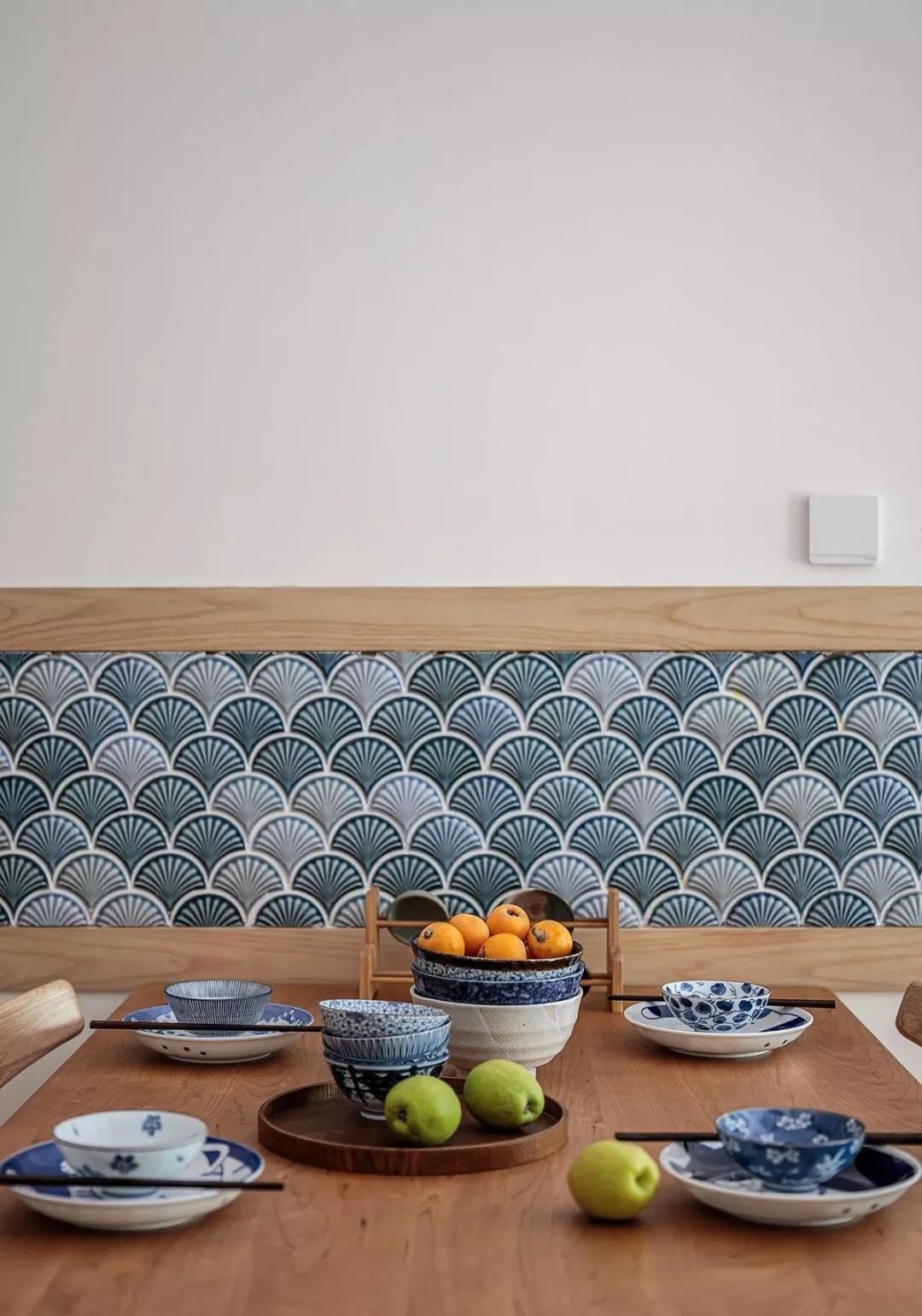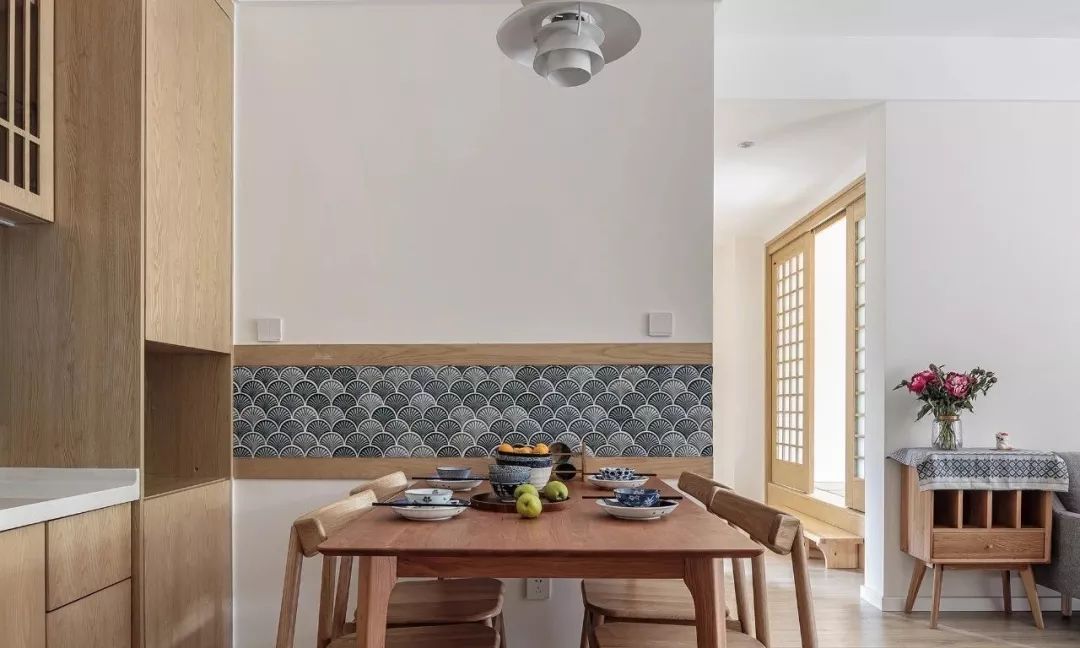 餐厅背景,利用大面积留白的墙面搭配和风瓷砖+原木色条收边设计,可见屋主对日式元素的喜爱。