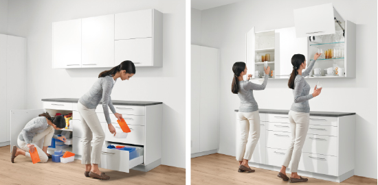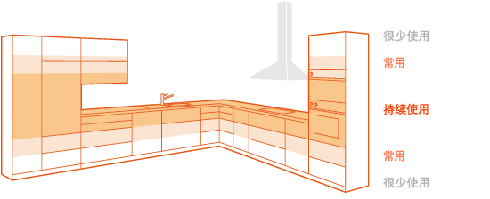 橱柜台面水平沿线为最为常用的区域,几乎所有操作都在此完成,且为持续使用;