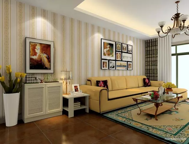 ▲优雅花纹壁纸客厅的简欧风格很相搭,更显典雅。