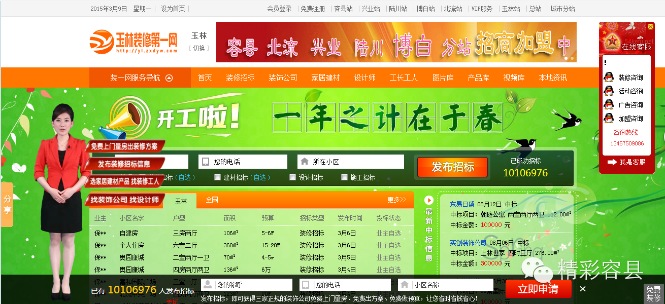 随着13年过年期间,回到了自己的家乡玉林容县,对周边市区、县城装修行业进行了调研,最终于13年年初回到厦门后,并开始签约代理了“装修第一网”玉林分站,并成为了玉林装修第一网CEO。