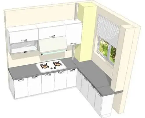 常见的厨房为矩形,橱柜一般为L型,靠窗部位一般放水槽,较长的墙面悬挂油烟机。