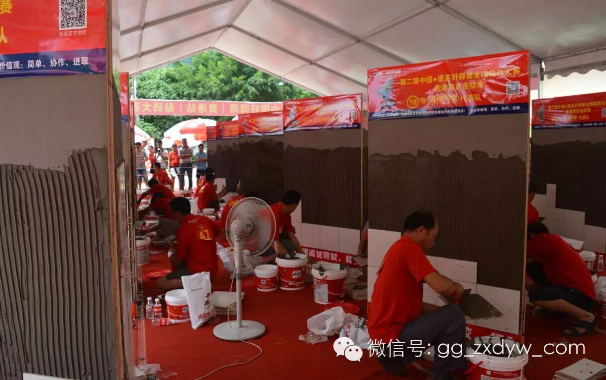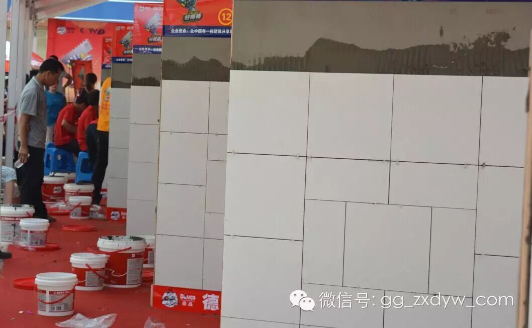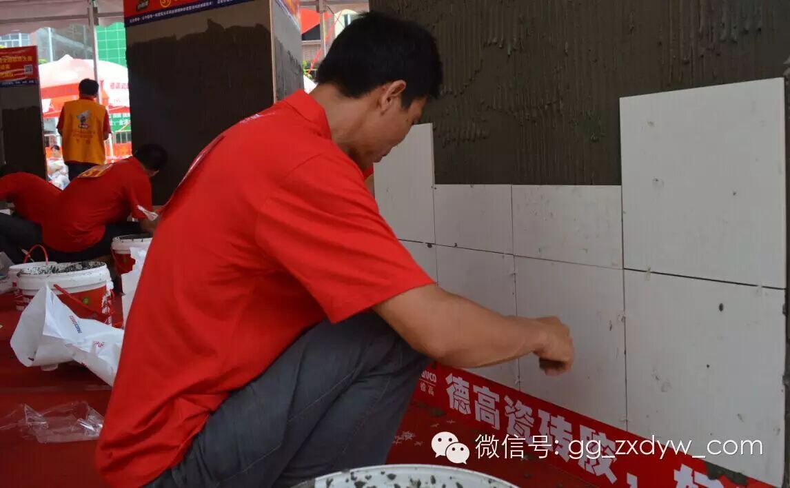 10点50分,比赛开始了,这是“中国好师傅”大赛现场,德高在偌大的广场搭建了高大的帐篷,炎热的太阳射线被拒之赛场之外。一声令下,师傅们在赛场上随即挥洒刮刀,贴砖比赛是一场综合性的较量,师傅们不单单是比速度,更是比质量。来自“中国好师傅”评判组的技术裁判会从平整度、留缝质量、满浆率、现场清洁等方面进行综合评比,秉着公平公开公正的原则,选出真正的“中国好师傅”。