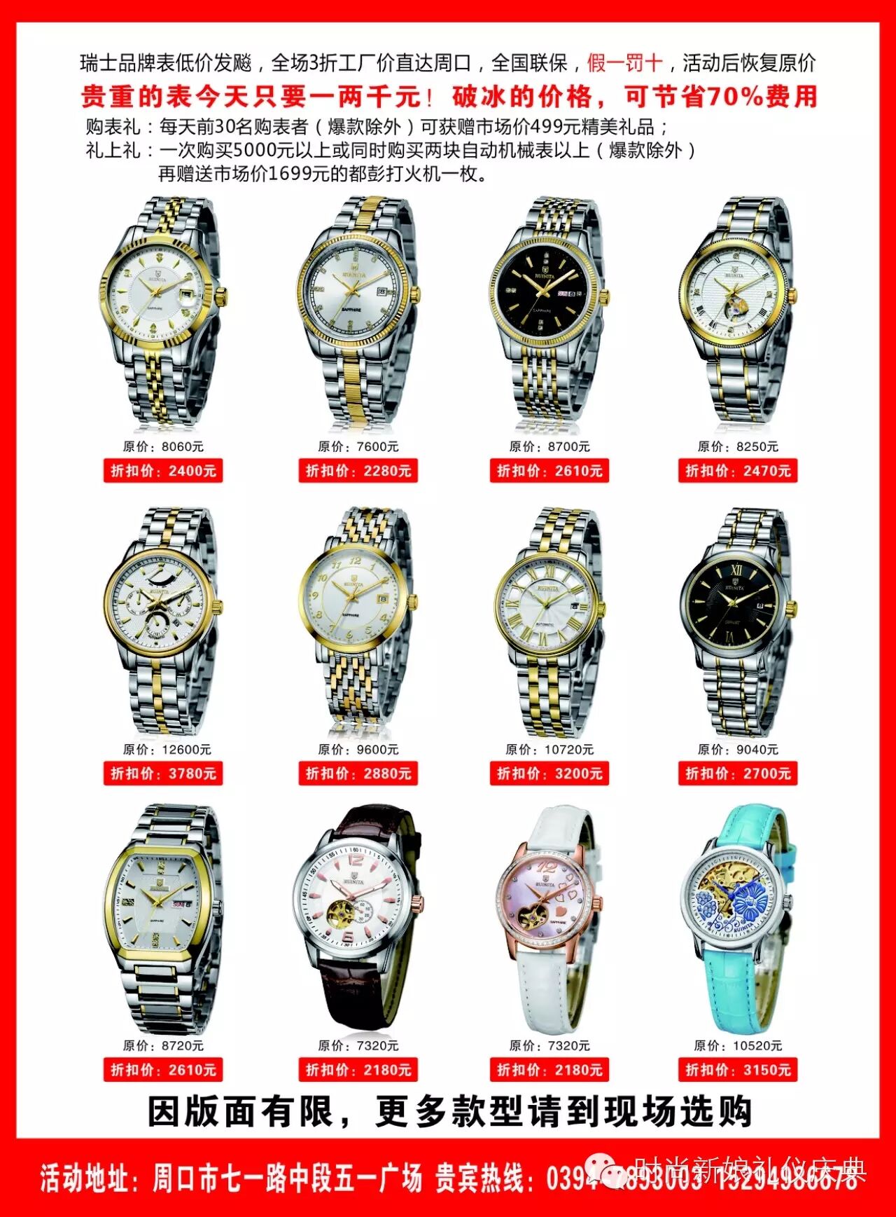 据了解,本次活动销售的所有腕表均从瑞尼达品牌方直接供货,一站到周口,省去了店面扣点、广告费、装修费、人员工资、资金占压成本等全部中间环节,直接从工厂到消费者,让您以真正低廉的价格买到货真价实的好腕表。