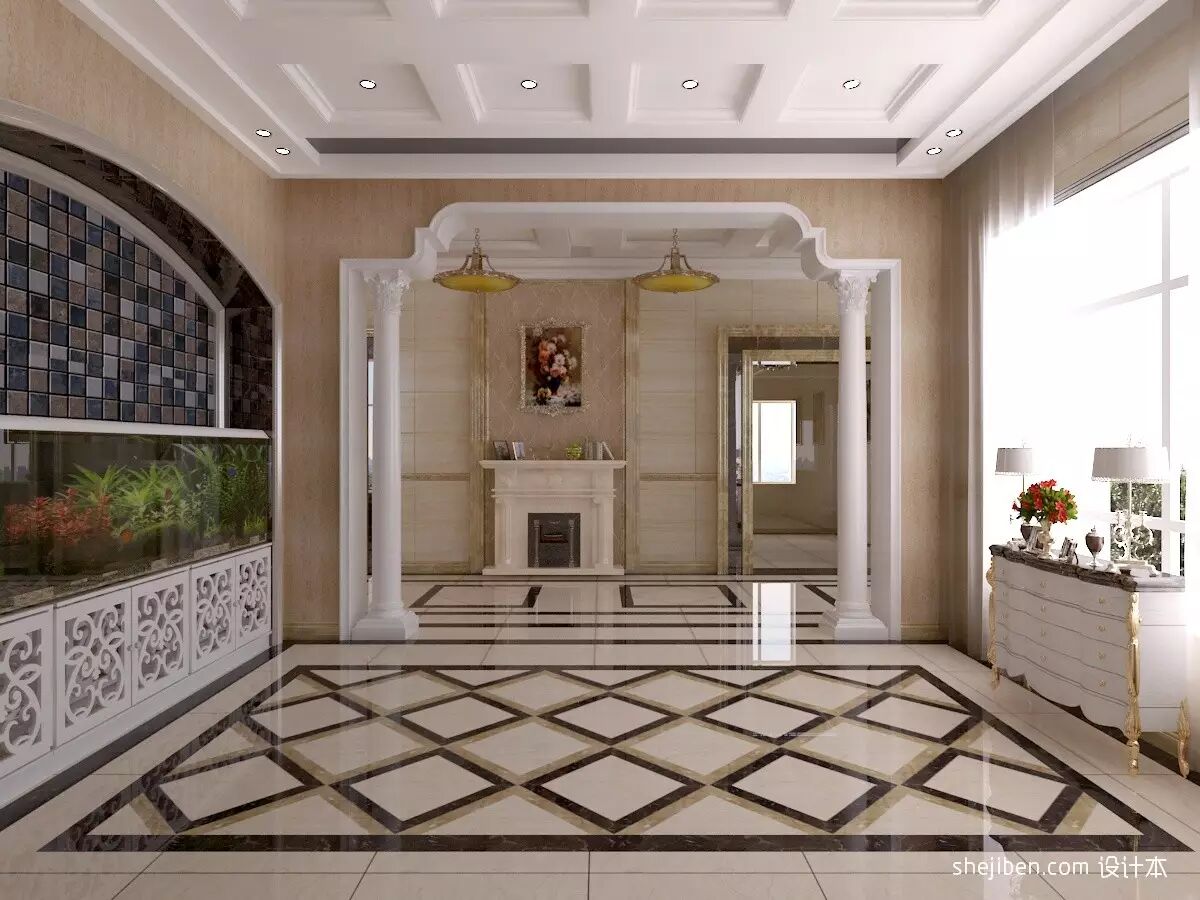 深色代表厚重,象征根基深厚。如果想使地板看起来明亮,则可用深色石料四围包边,而中间部分采用较浅色的石材。如果玄关铺的是地毯,其要求和地板同理。