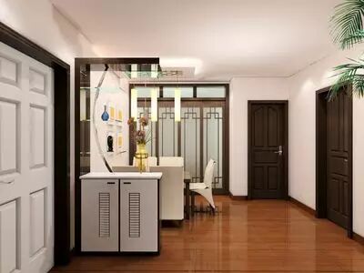 玄关的间隔应以通透为主,选取磨砂玻璃效果。如果必须采用木板,那么应该采用色调明亮不花哨的木板,不可选用色调太深的木板,易有笨拙阴暗之感。