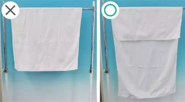晾毛巾时,要将毛巾搭的一长一短,也可以用带夹子的衣架将毛巾夹成M状,这些都可以加快毛巾水分挥发。