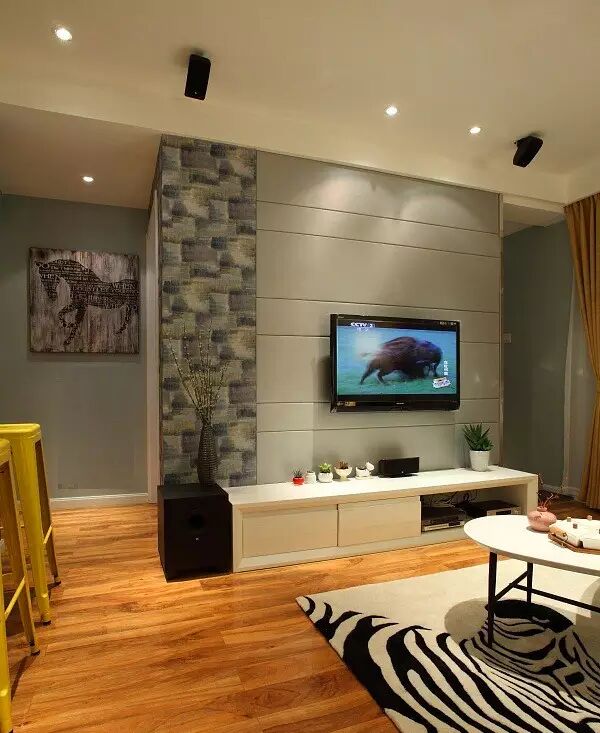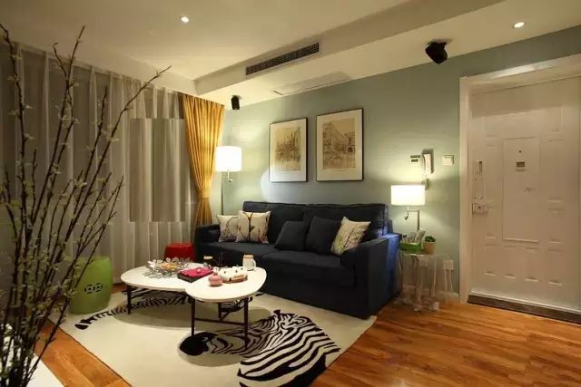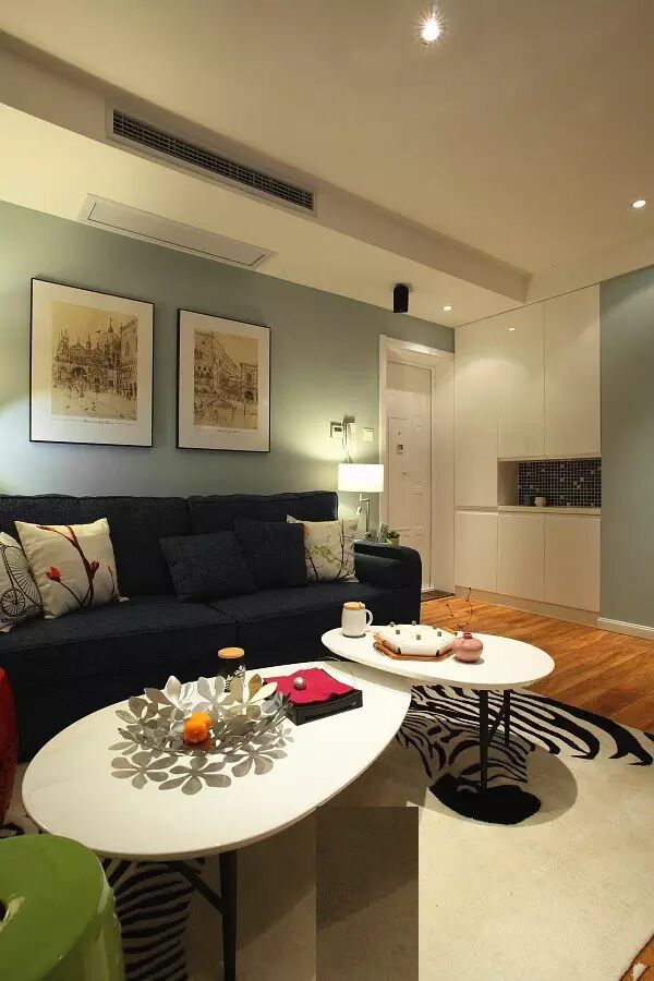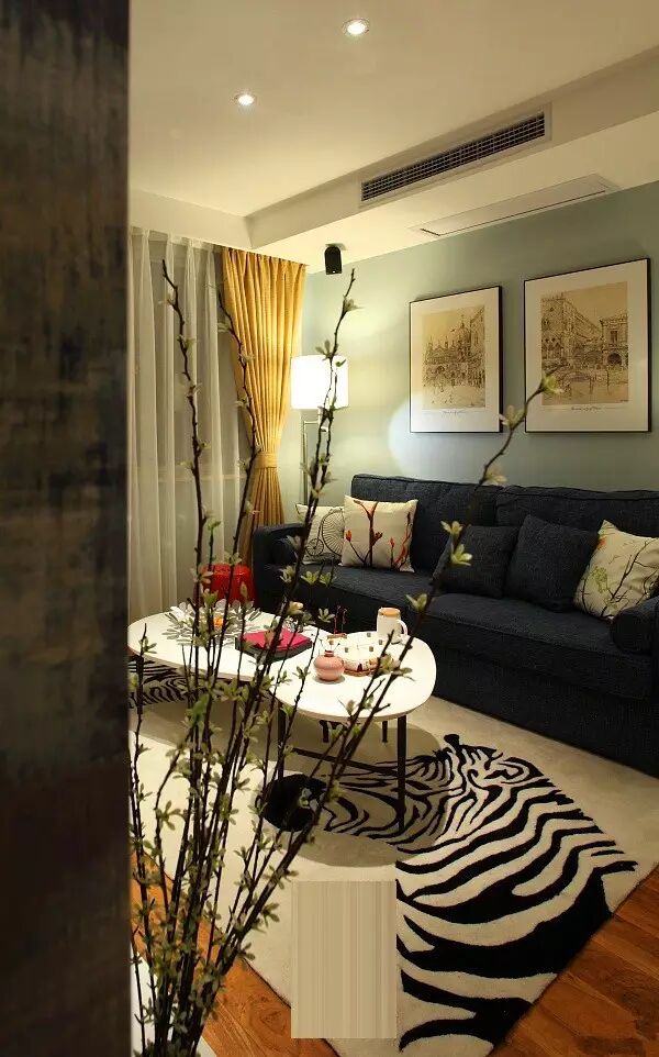 淡蓝色的墙面衬托出了客厅的质感,地上的斑马纹地毯也是家里的点睛之笔。