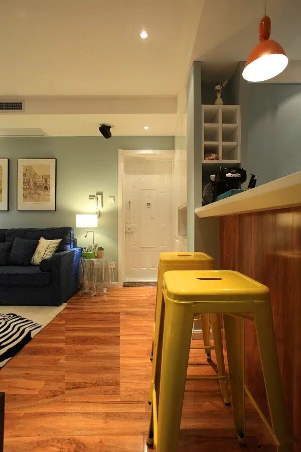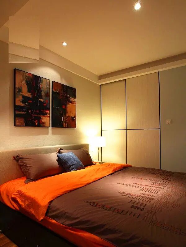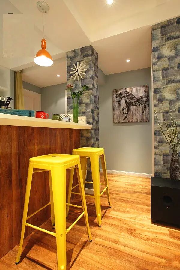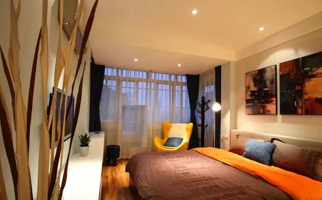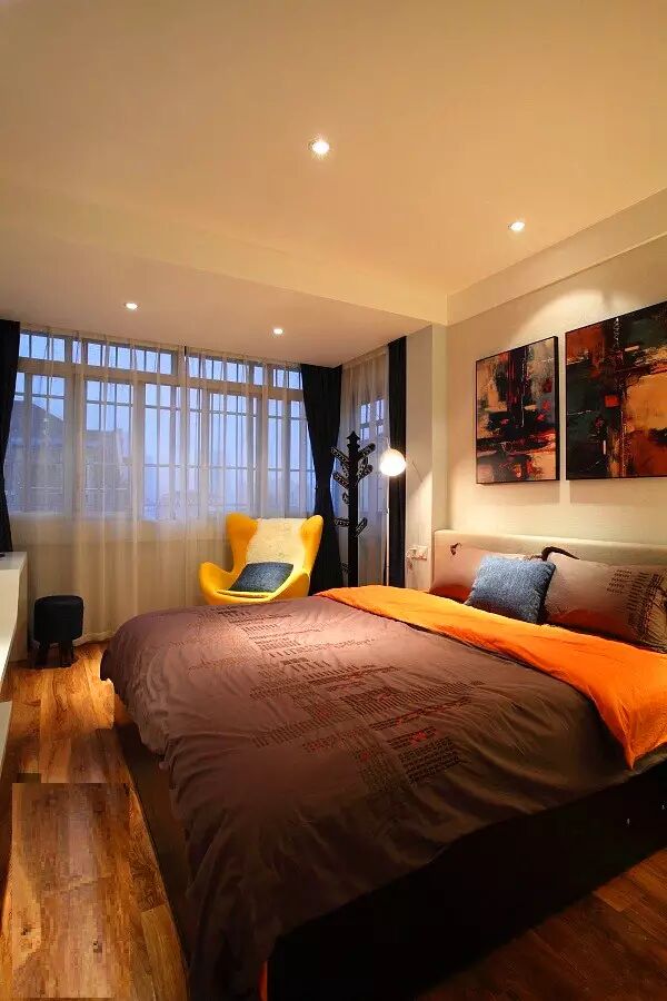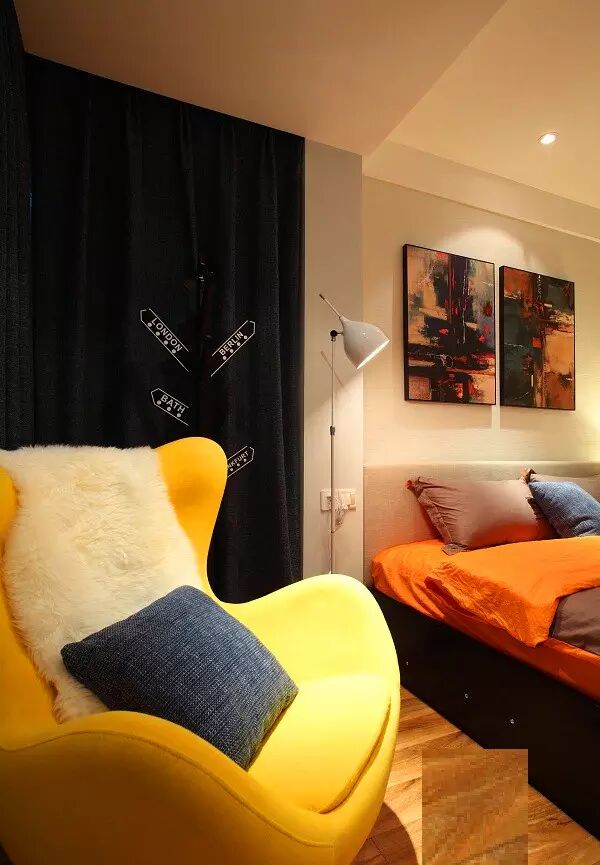 亮黄色的座椅可是卧室里的一大亮点,和墙上的抽象画摆在一起,艺术气息十足。