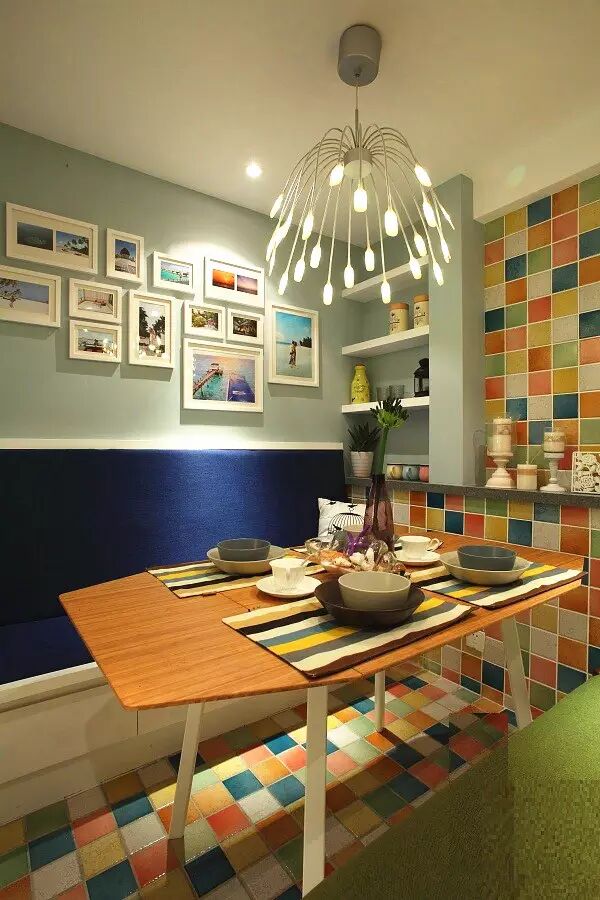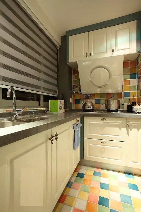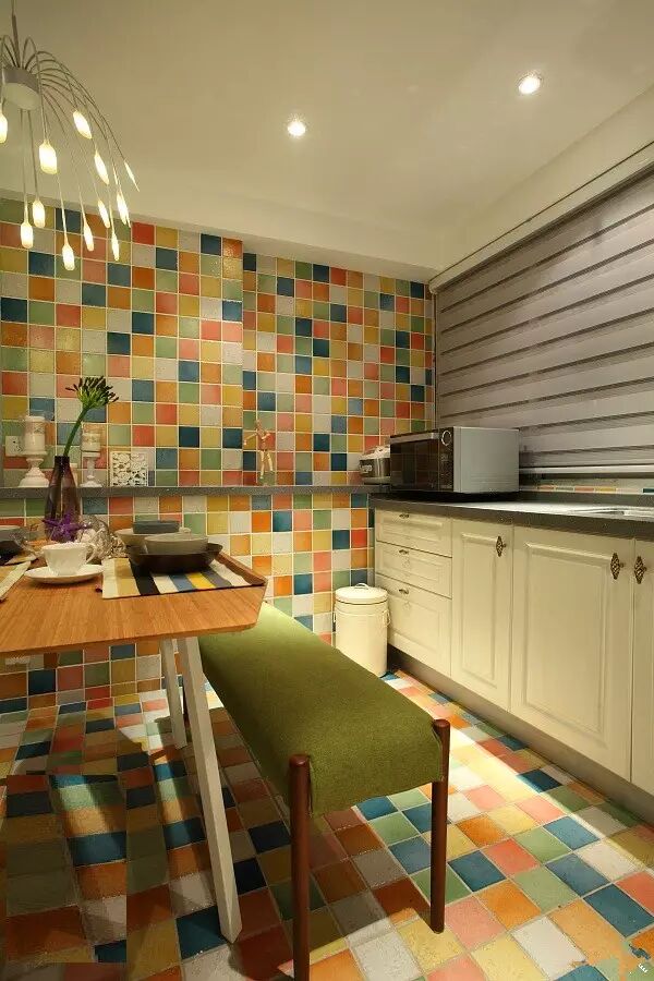 经过设计师巧手改造之后,厨房空间变的利用率超高!不仅涵盖了厨房应该有的功能,同时还增添了餐厅区域,彩色的小方砖很有春天的感觉。