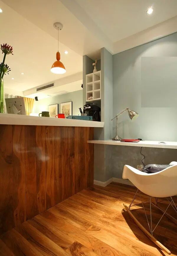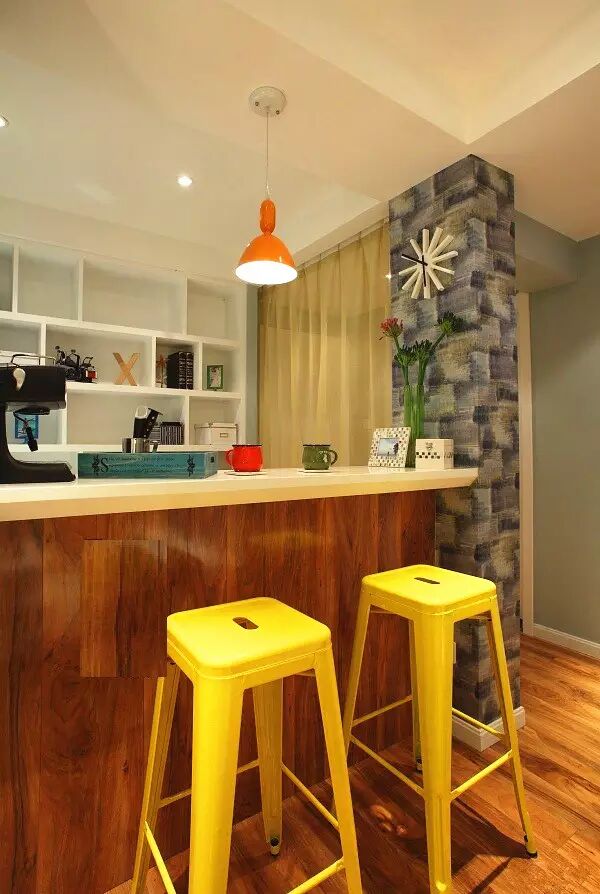 另一侧的厨房空间也并没有被浪费,小吧台的设计很有情调,另一侧的大书架还可以作为书房的区域,很实用。